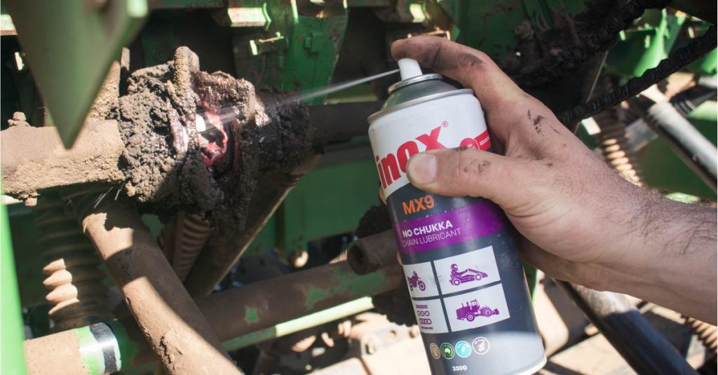 “MX9 can provide lubrication which gets into the link and prevents locking up. Because it resists flick off, there is nothing on the chain guard to attract dirt and crop residue under farming conditions,” says Angela.