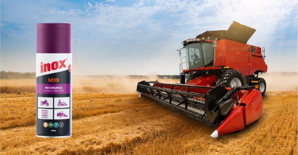 The INOX-MX9 No-Chukka Chain Lube lubricates the combine harvester chains by allowing for high-speed operations where there will be extreme pressure on the chain. It achieves this by employing tackifiers, coagulants, anti-corrosion, and water proofing compounds to form a lasting relationship with the chain.
